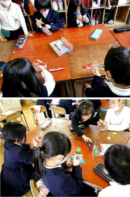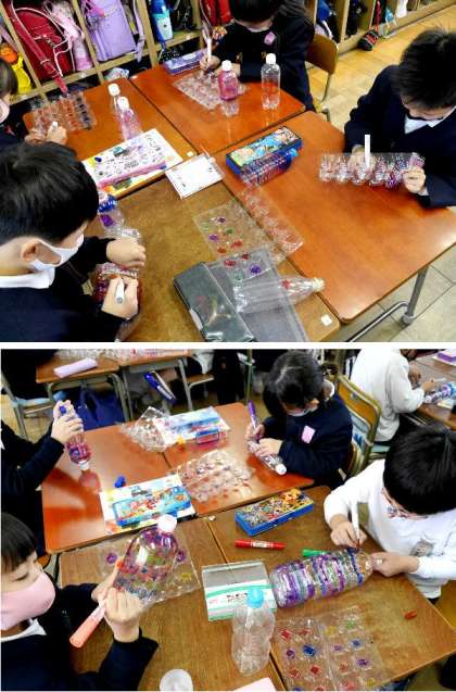 2年生がペットボトルにマジックでカラフルな色づけをしています。太陽にてらしてみるといろんな色が混ざり合ってひかりますね。