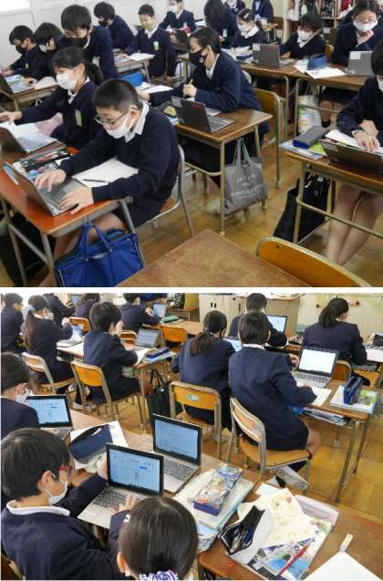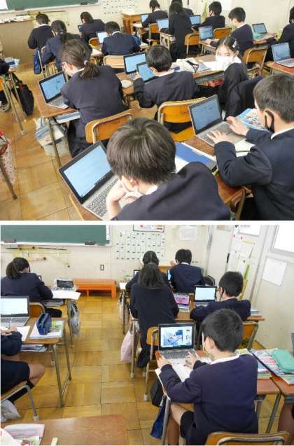 5年生が社会で、「なぜ、コンビニは便利なのか」を調べています。新しいパソコンにも少しずつ慣れていきましょう。