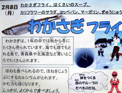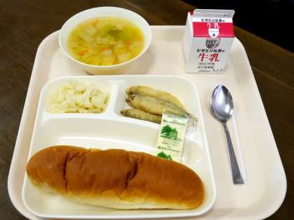 今日の献立は、わかさぎフライ、白菜のスープ、カリフラワーのサラダ、コッペパン、マーガリン、牛乳でした。