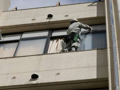 卒業式をひかえて、学校の高所窓など、業者の方に清掃してもらっています。ふだん清掃できないところをお願いしています。