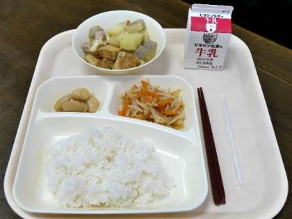 今日の献立は、関東煮、あまずあえ、しろはな豆の煮もの、ごはん、牛乳でした。