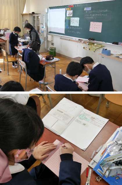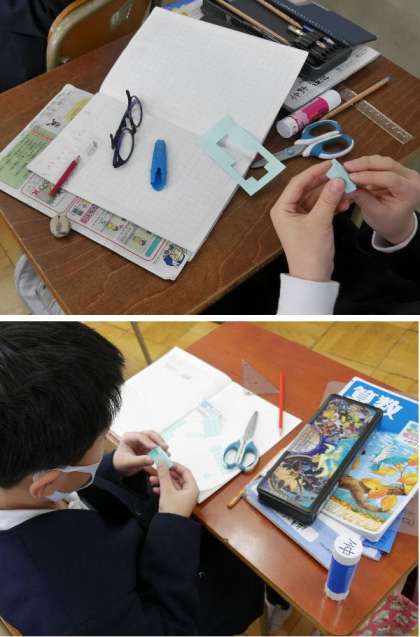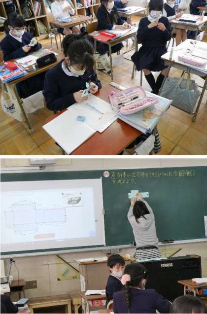 4年生の算数では、3学級に分かれて、直方体を切り開いた展開図について学習しています。実際に切り取って直方体を作っていました。