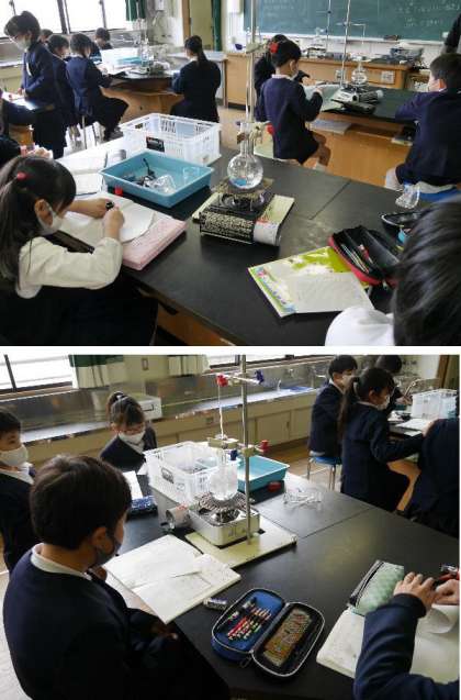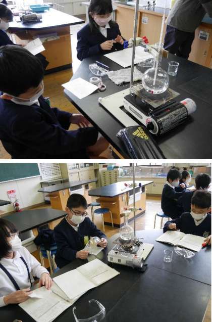 4年生が理科室で実験です。水を熱しつづけるとどうなるだろうか、2分ごとに温度をはかったり様子を観察しました。