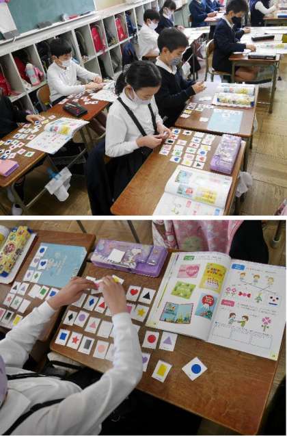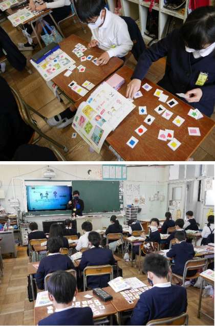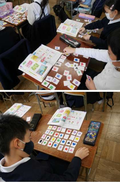 3年生が、いろいろな色形カードを机に並べています。英語での説明をきいてカードをとって、グリーティングカードを作っていきます。しっかり、ネイティブの発音を聞き取っています。