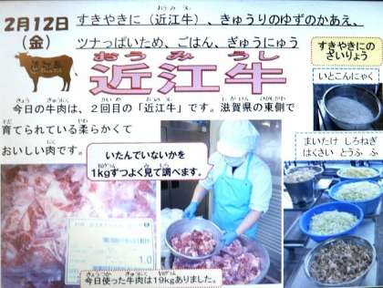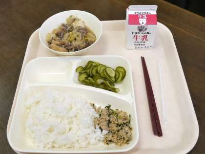 今日の献立は、すきやき煮(近江牛)、きゅうりのゆずのかあえ、ツナっぱいため、ごはん、牛乳でした。