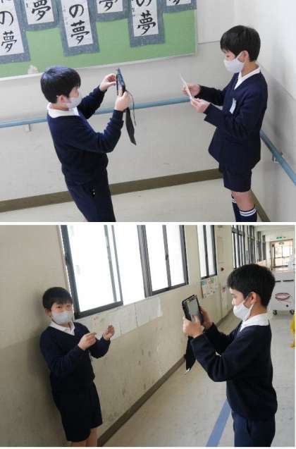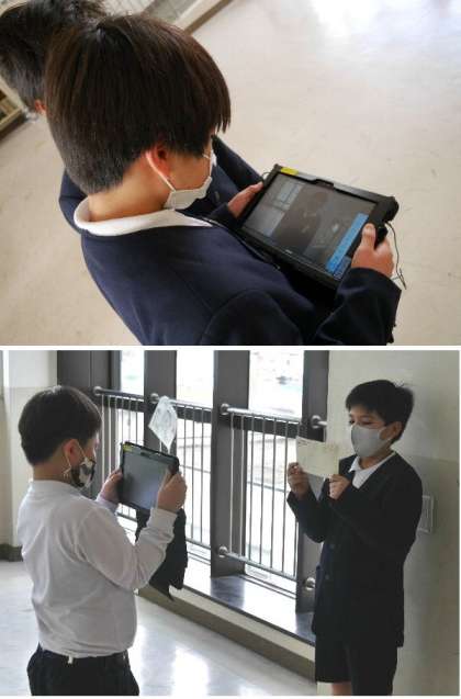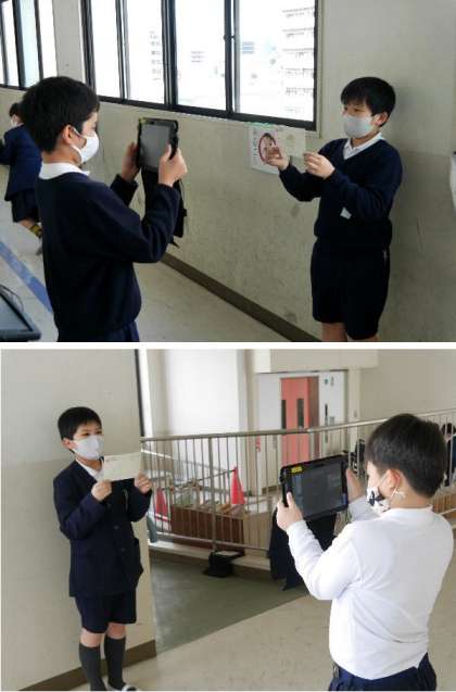 5年生の英語では、ようこそ日本へと、日本を説明する練習をしています。ペアでタブレットで動画を撮っているところです。