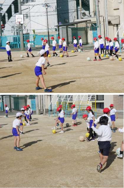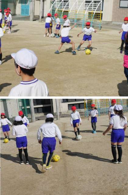 2年生がサッカーボールをけって相手をかわしていきます。実践的な練習ですね。