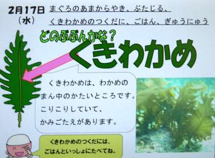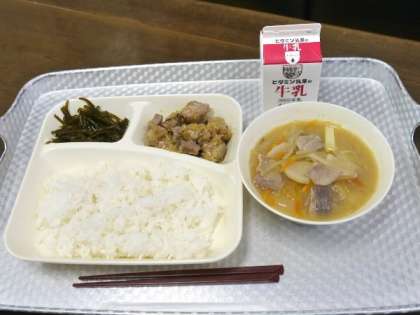 今日の献立は、まぐろの甘辛焼き、豚汁、茎わかめの佃煮、ごはん、牛乳でした。今日もごはんがすすむメニューでおいしいですね。