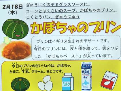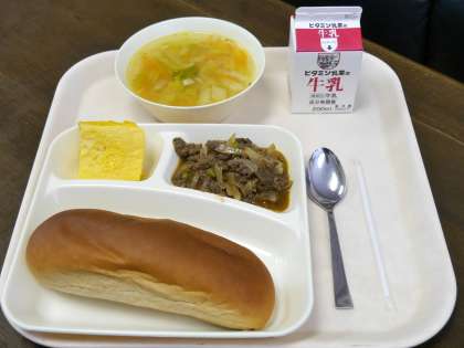 今日の献立は、牛肉のデミグラスソース煮、コーンと白菜のスープ、かぼちゃプリン、黒糖パン、牛乳でした。