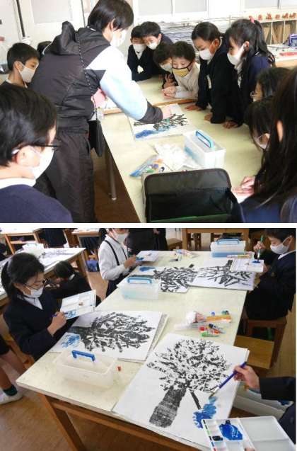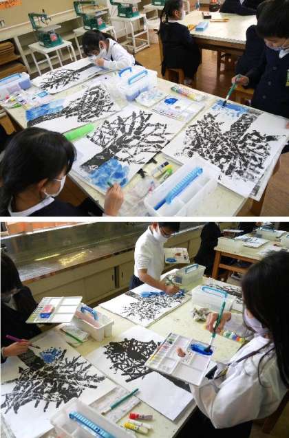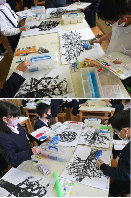 3年生が図工室で、紙版画で作ったもちもちの木に絵具で色づけしています。水でぼかしながらていねいに、それぞれの色をぬっています。