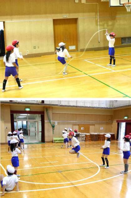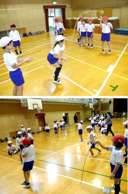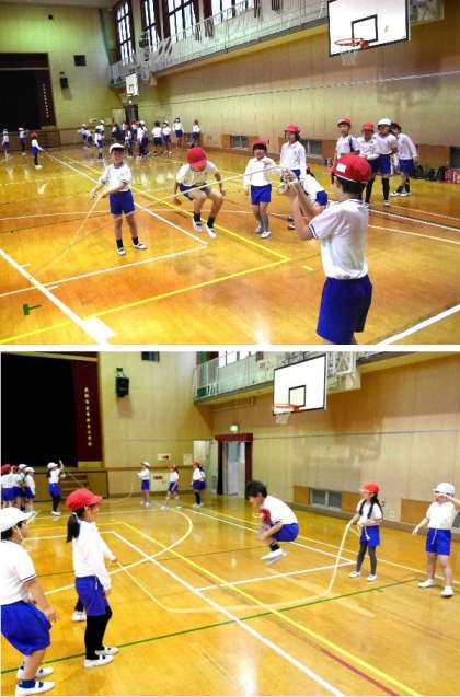 今日は雨なので、体育館でおおなわとびの練習です。うまくタイミングよくとびこんで跳ぶのもむずかしいですね。なかなか足が前にすすみません。