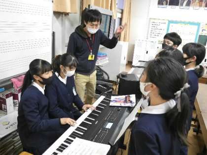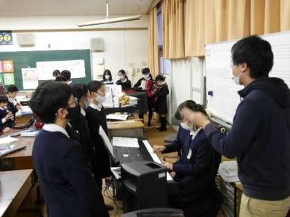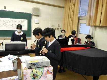 6年の音楽です。担任の先生もリズムをとり、熱心に取り組んでいます。