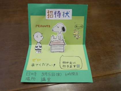 6年生から、茶話会の招待状をいただきました。金曜日に講堂で行います。今年は、間隔をとって体育館で、高学年関係の先生だけの招待となりました。