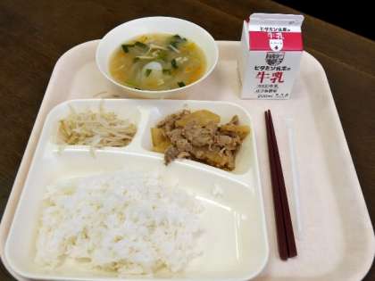 今日の献立は、豚肉のコチジャン炒め、トック、もやしのナムル、ごはん、牛乳でした。