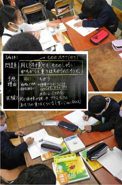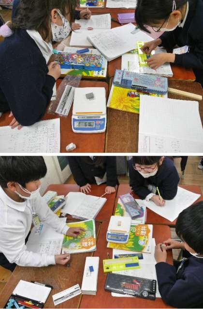 3年生の理科では、同じ大きさのものでも重さがちがうのか、電子てんびんで確認してみました。木やプラスチック、鉄などを比べてみました。