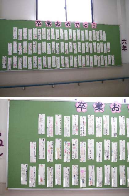 6年生の掲示板が、6年生からの卒業メッセージカードが貼られています。