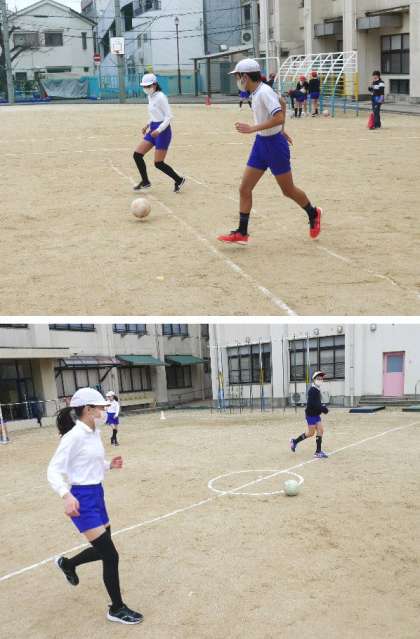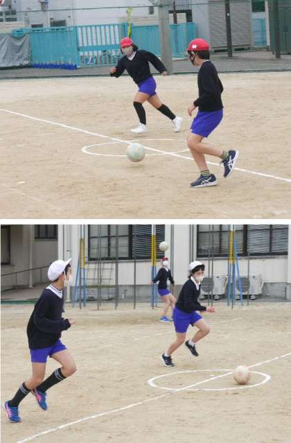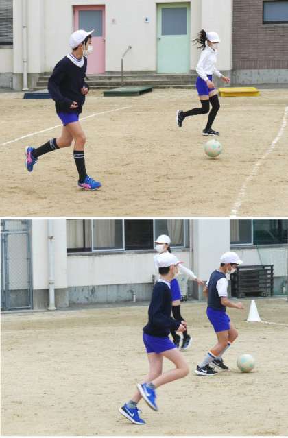 6年生がサッカーの練習で、ペアでドリブルの練習をしています。タイミングをあわせて最後にシュートだ。