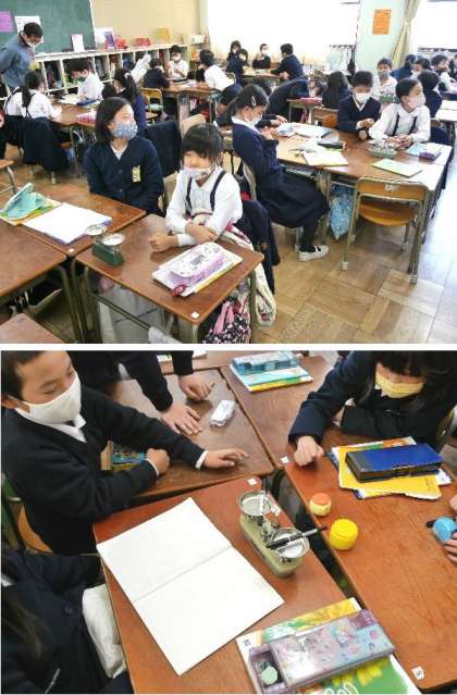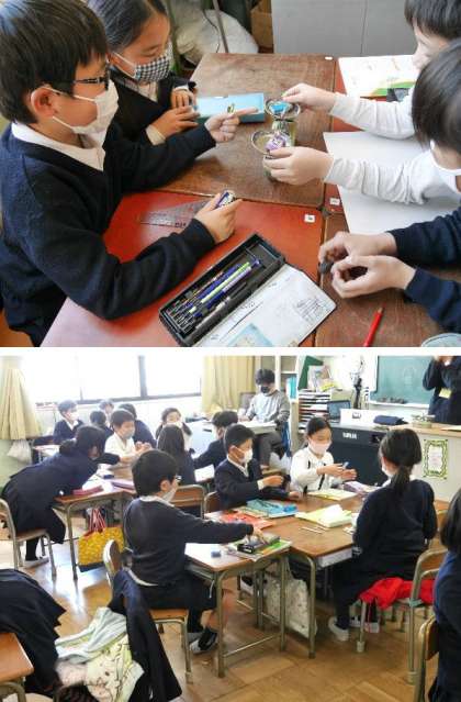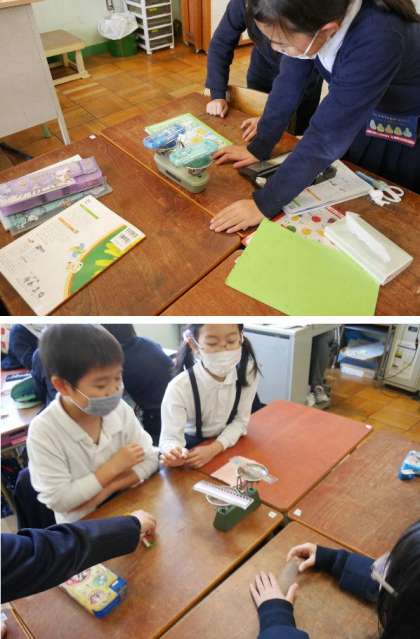 3年生が理科で、上皿てんびんの使い方をマスターするために練習しています。