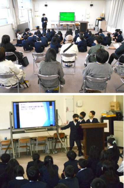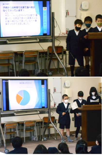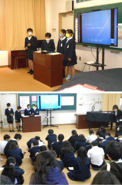 5年生は多目的室と音楽室に分かれて、キャリア教育で調べたり話し合った「防災」について、プレゼン発表を行いました。