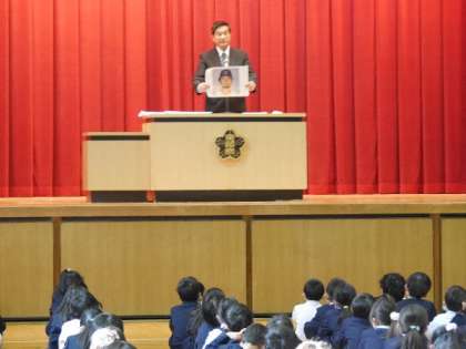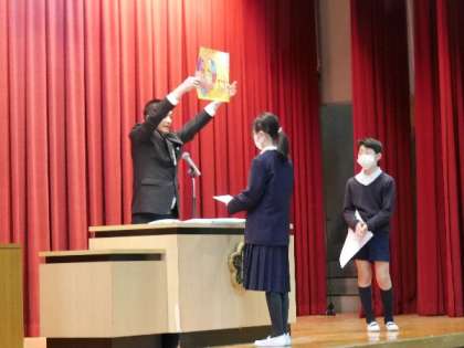 緊急事態宣言が解除され、講堂で全校朝会をおこないました。6年生にとっては最後の朝会となりますね。全校朝会で、国際平和ポスター入賞者の表彰をおこないました。