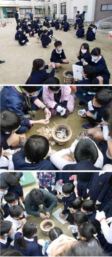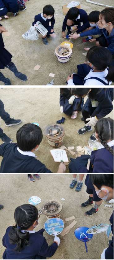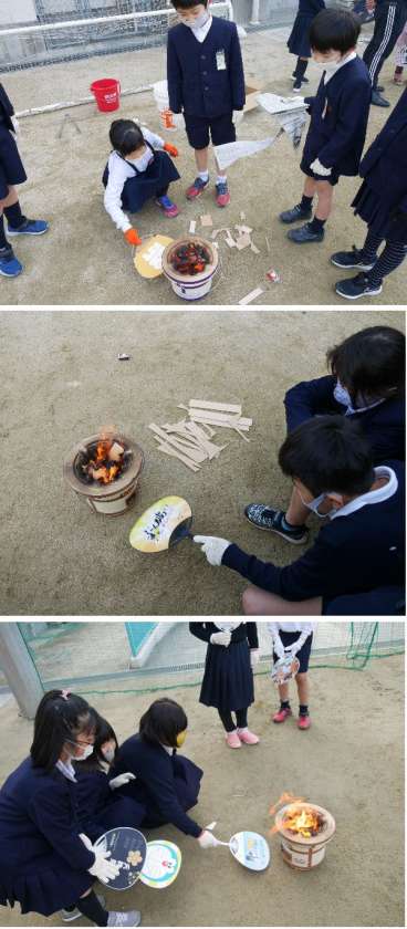 3年生では、延期にしていた七輪体験を運動場でおこないました。マッチで火をつけるのが初めての子もいます。マッチのつけ方の練習をして、新聞紙に火をつけ、木切れ、炭へと火をつけていきます。うちわを上手につかって火をおこしていきます。