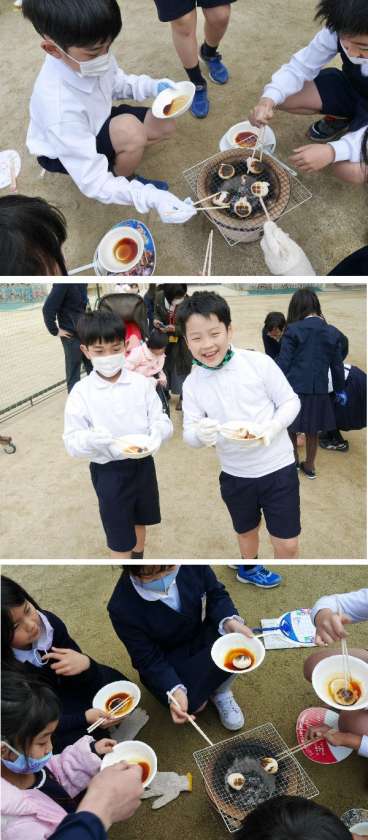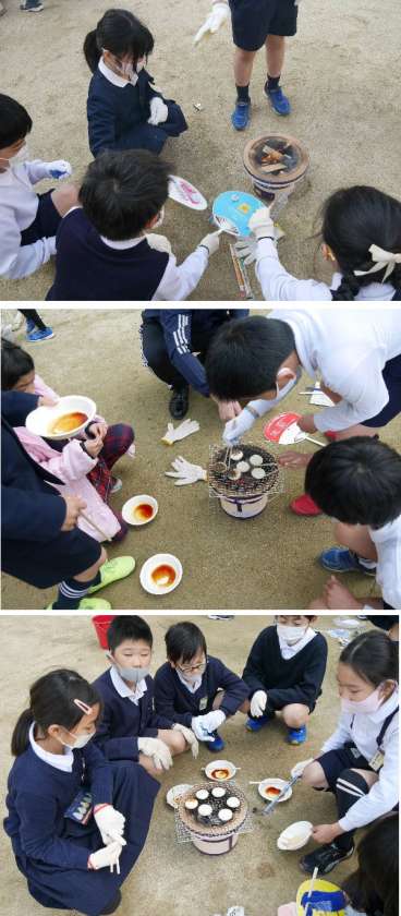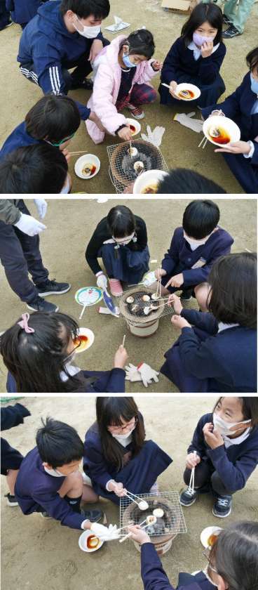 3年七輪体験で炭に火をおこしたあと、網でおもちを焼きました。とてもおいしく焼けたので、しょうゆをつけて食べました。