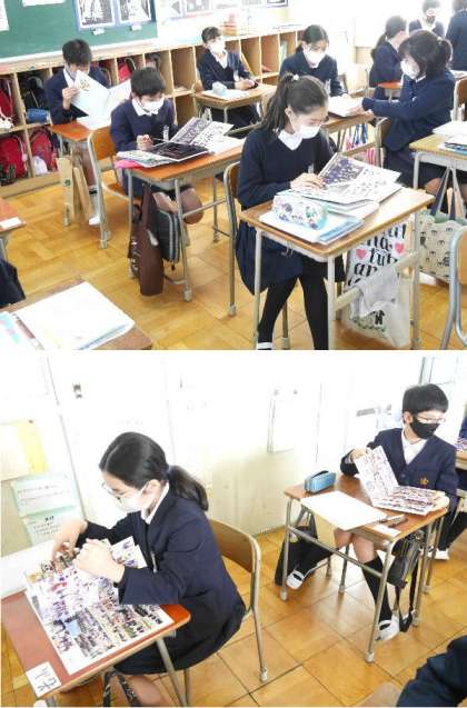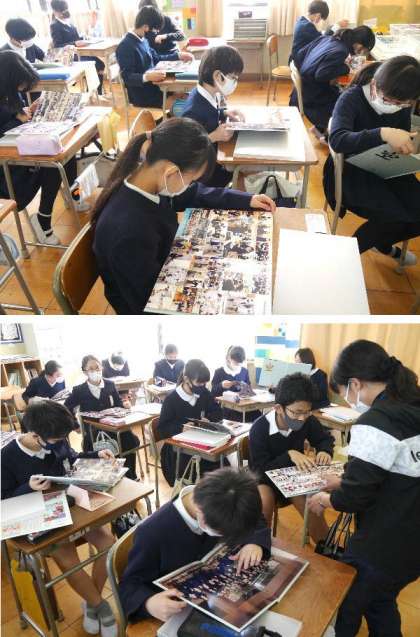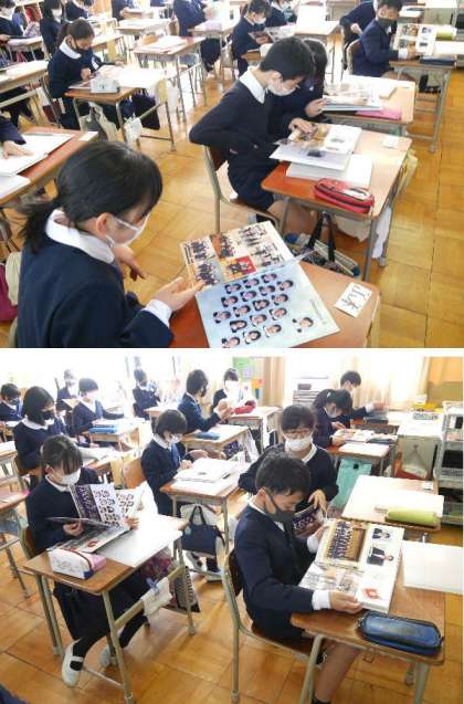 6年生の卒業アルバムができあがってきました。6年生がアルバムをみています。