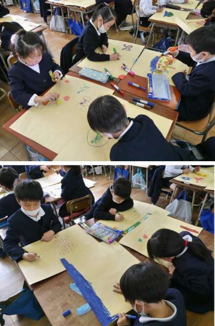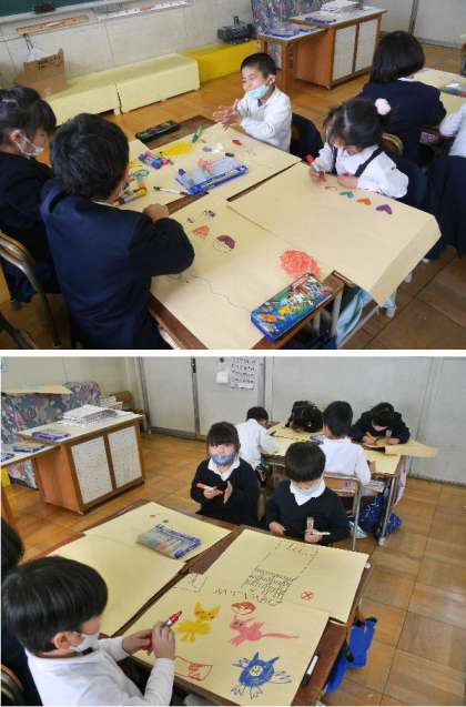1年生が、作った作品を入れる袋をつくっています。