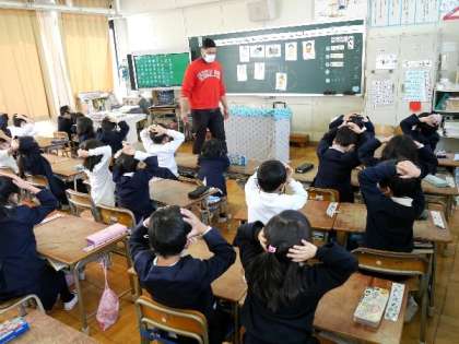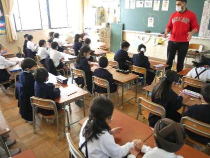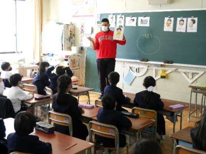 1年生の授業にクリス先生が来てくれました。英語でゲームです。とても盛りあがって楽しそうです。