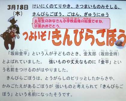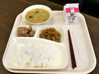 今日の献立は、鶏肉のてりやき、さつきいものみそ汁、きんぴらごぼう、ごはん、牛乳でした。