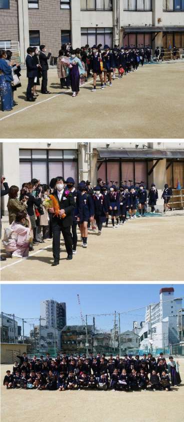 卒業生は運動場の花道を通ってお祝いをうけて、笑顔で巣立っていきました。