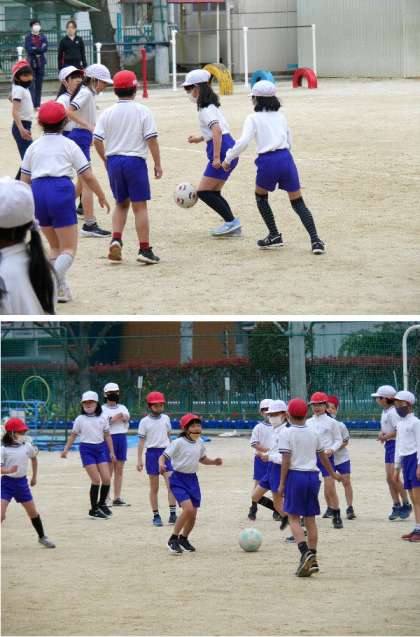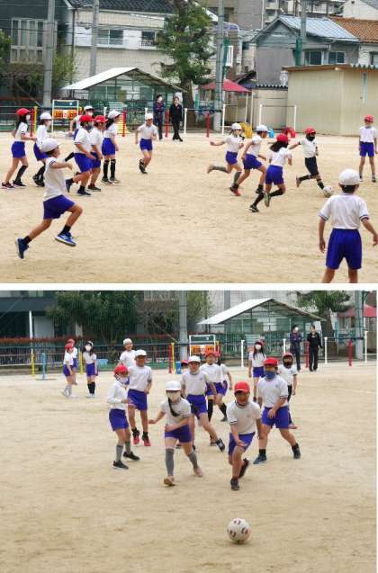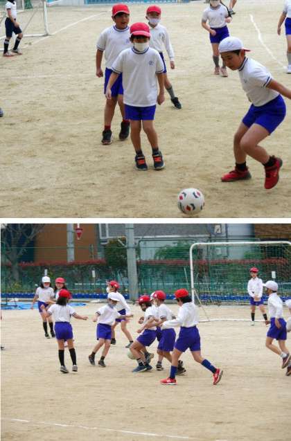 3年生が運動場で、サッカーの対戦をしています。ボールの取り合いに白熱しています。