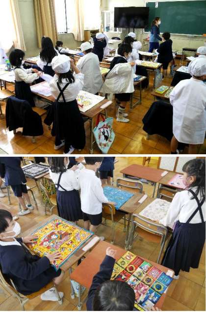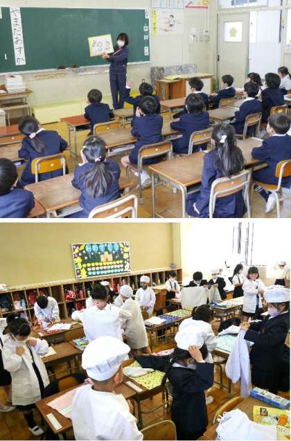 今日から給食が始まります。1年生は小学校でのはじめての給食です。担任の先生がていねいに流れを説明してくれて、給食着に着替えて、ナプキンを机にひいて準備をしています。しばらくの間は、6年生が給食の食缶を運んでくれて配膳もしてくれます。うれしいですね。