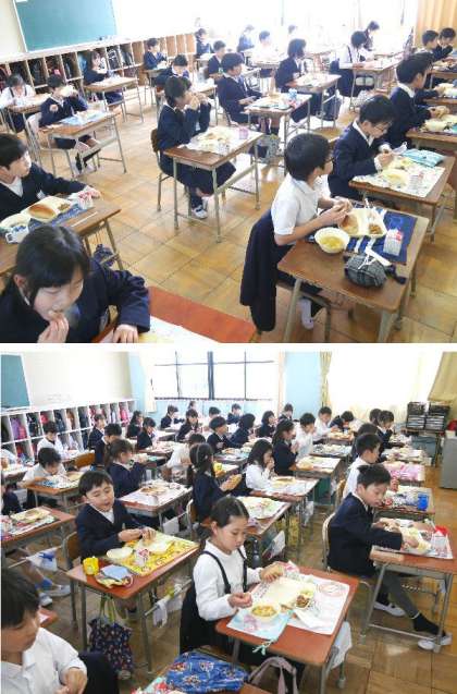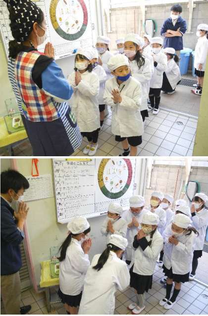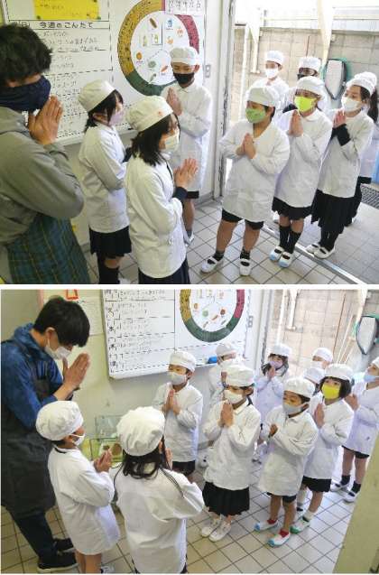 今日から給食がスタート。各学級の給食係が給食室で受け取りました。給食調理員さん、おいしい給食をありがとうございます。これから1年間、よろしくお願いいたします。