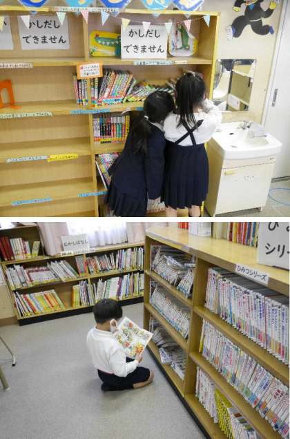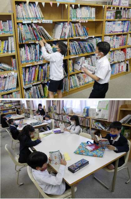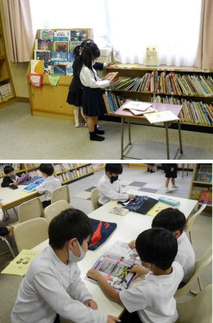 2年生が図書室で読書をしています。本を借りることもできます。みんなよく本を読んでいます。