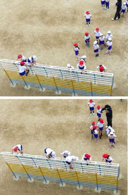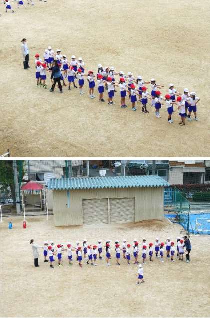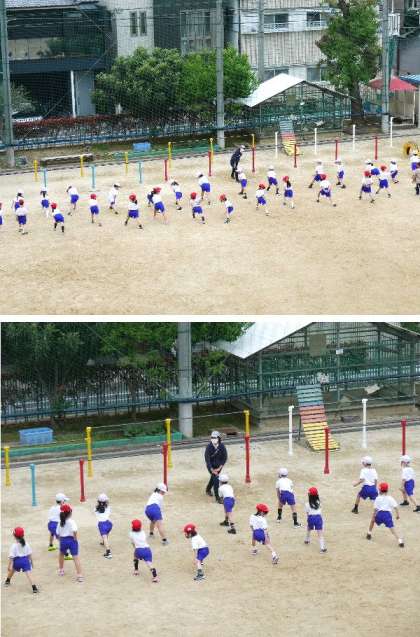 1年生が運動場で体育をしています。整列の練習もがんばっています。