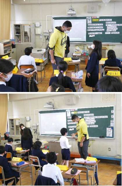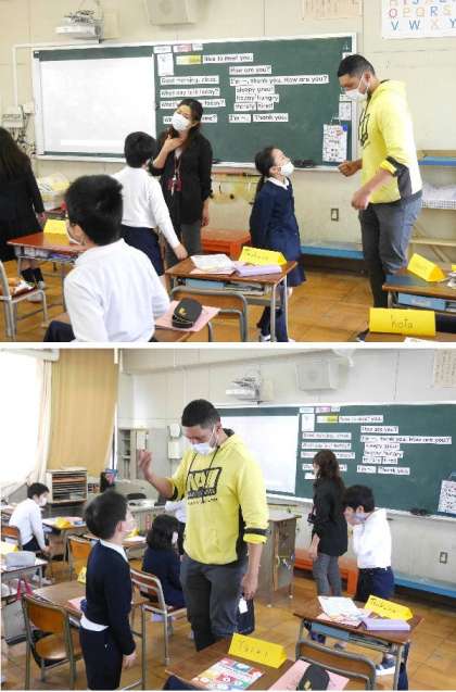 今年も引き続き、ネイティブ英語のクリス先生が来校され授業をおこなっていただきます。今日は5年生で、「Nice to meet you.」と英語であいさつをする練習をしました。