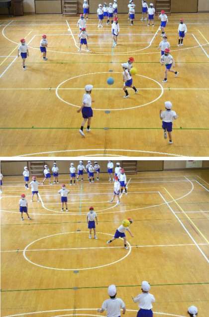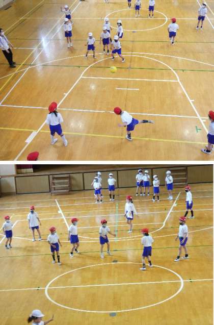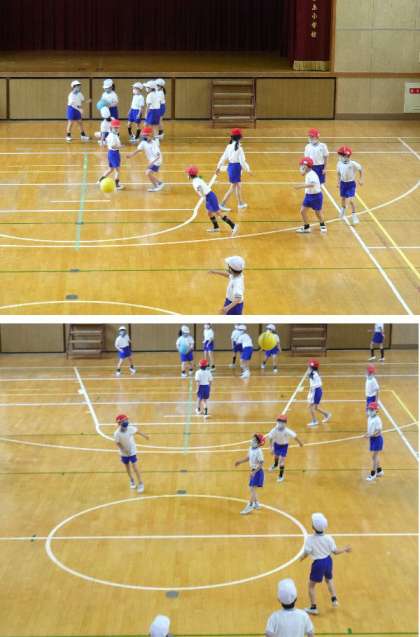 2年生が体育館でドッヂボールをしていました。元気はつらつです。