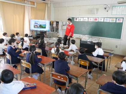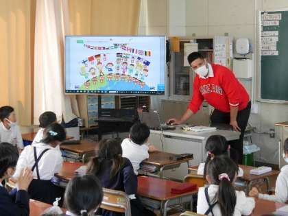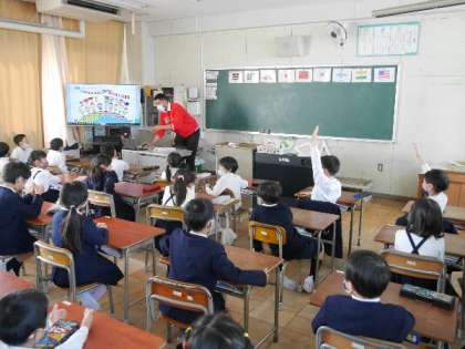 2年生に、英語ネイティブのクリス先生が来てくれました。いろんな外国について英語で学習しました。