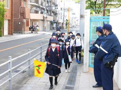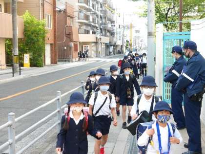 4月20日 朝の登校!警察官も見守っていただき