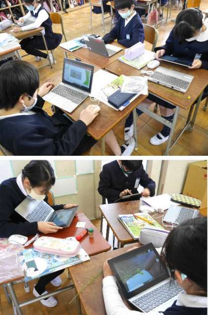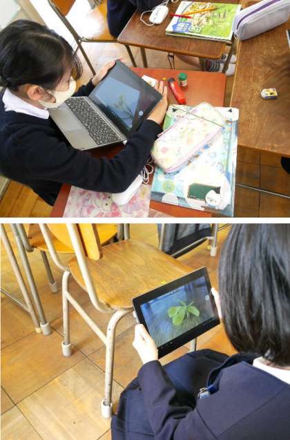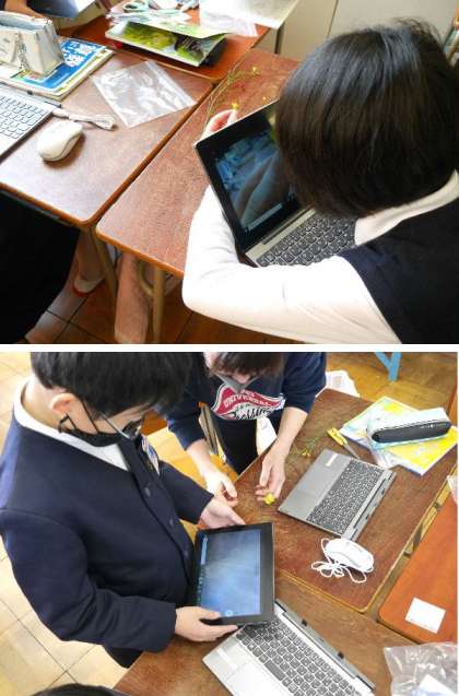 4年生の理科では、新しいパソコンタブレットで、アブラナの花や茎を観察してカメラで撮ったりしていました。写真をもとにパワーポイントで観察資料も作っていました。