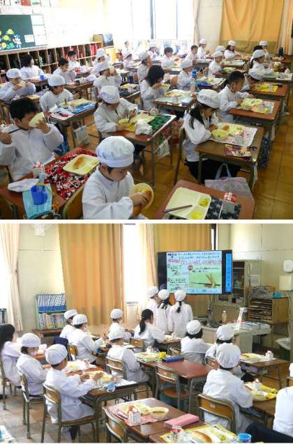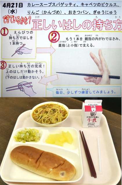 今日の献立は、カレースープスパゲッティ7、キャベツのピクルス、りんご(缶)、おさつパン、牛乳でした。