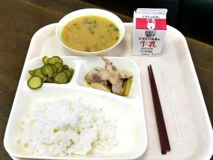 今日の献立は、やきとり、みそしる、きゅうりのゆず風味、ごはん、牛乳でした。