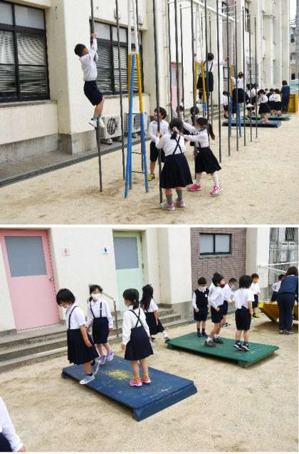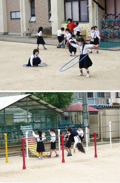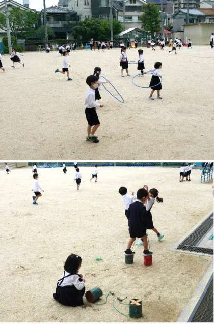 1年生が、3時間目のおわりに運動場で元気いっぱいに遊んでいます。ずっと部屋に閉じこもってばかりじゃ疲れるよね。