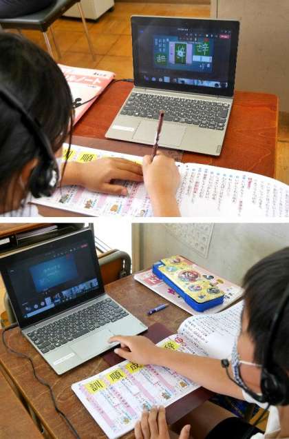 4年生のオンライン授業は、漢字の書き方の練習です。先生から、パワーポイントのデータを送ってもらって漢字の練習をしました。