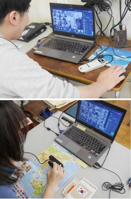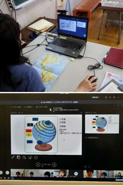 5年生のオンライン授業は社会をおこないました。ウェブカメラで地図をみて確認したり、パワーポイントのデータで世界地図について学習しました。
