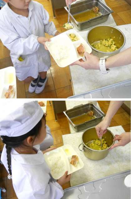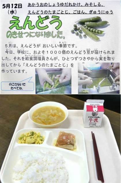 今日の献立は、あかうおのしょうゆだれかけ、みそしる、えんどう豆のたまごとじ、ごはん、牛乳でした。