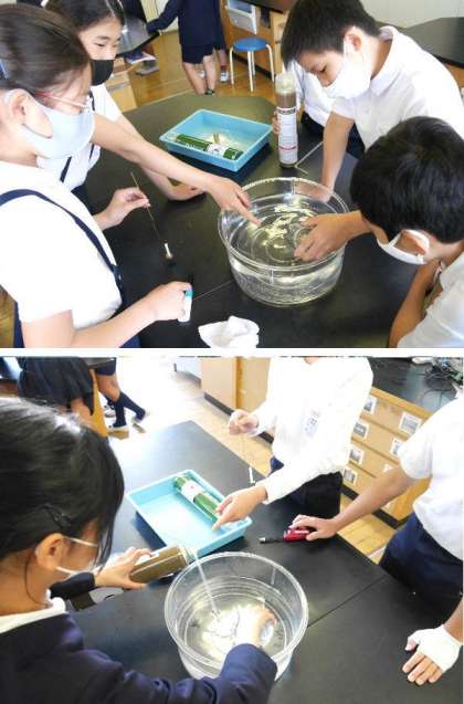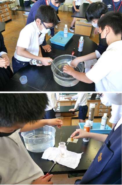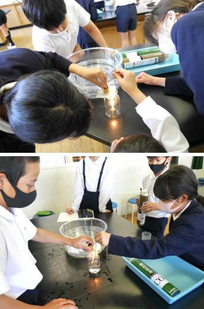 ちっ素、酸素、二酸化炭素をビーカーに充満させて、ろうそくの火を入れてみます。一番よく燃えるのはどれかな。水中の中で、他の気体が入らないように、じょうずに3つの気体を入れるのにてこずっています。