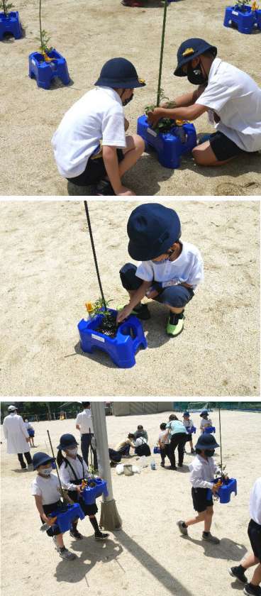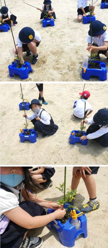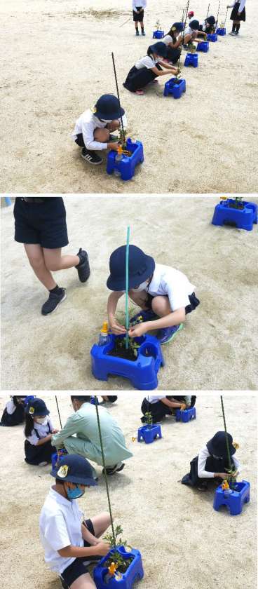 2年生が植えたミニトマトの苗も大きくなってきました。ミニトマトがたおれないように、まっすぐのびるように、支柱をたてました。そして、肥料もまいて水やりをしました。
