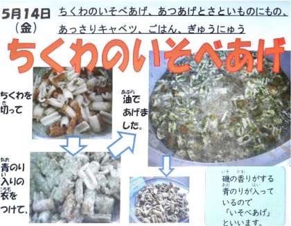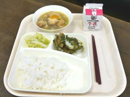 今日の献立は、ちくわのいそべあげ、厚揚げと里芋の煮物、あっさりキャベツ、ごはん、牛乳でした。